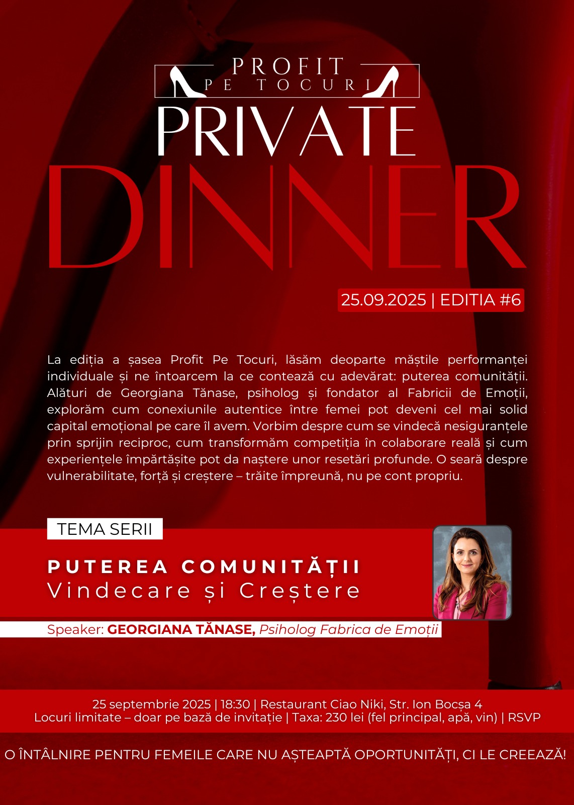 Pe 25 septembrie ne vedem la PRIVATE DINNER – Profit pe Tocuri, Ediția #6, pentru o seară în care nu vorbim despre perfecțiune, ci despre puterea comunității. 💫